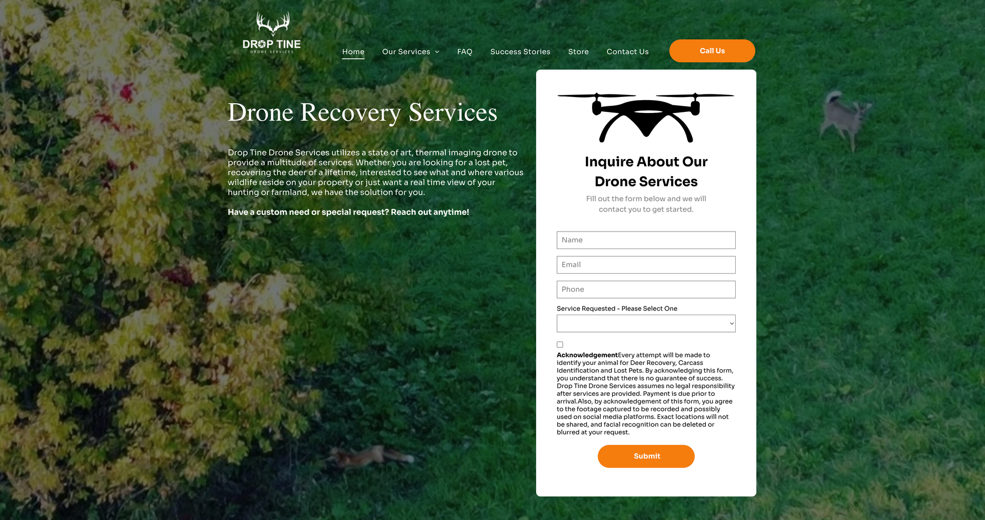 Drop Tine Drone Services utilizes a state of art, thermal imaging drone to provide a multitude of services. Whether you are looking for a lost pet, recovering the deer of a lifetime, interested to see what and where various wildlife reside on your property, or just want a real time view of your hunting or farmland, we have the solution for you.