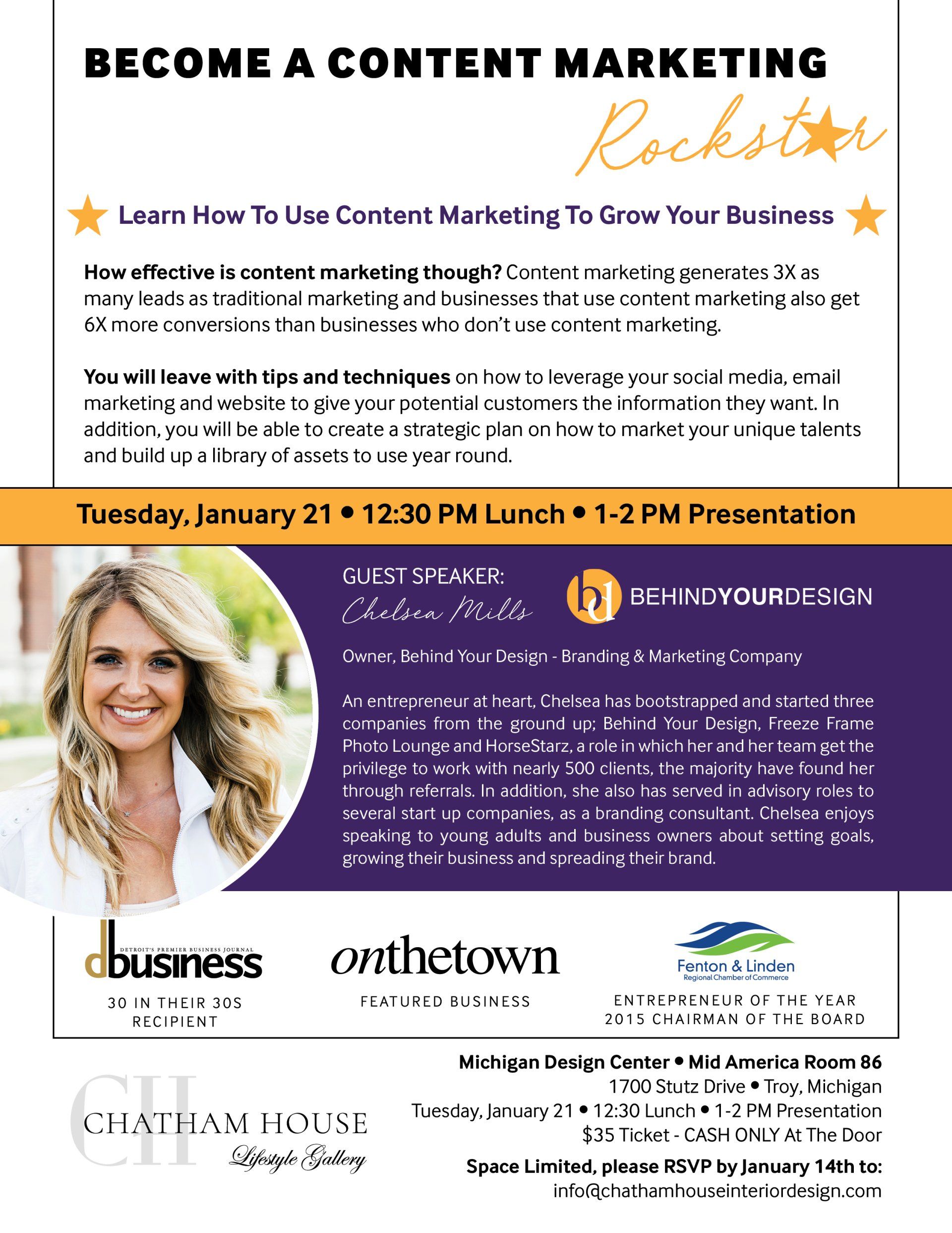 Recently, Chelsea Mills had the opportunity to present her seminar, 'Become A Content Marketing Rock Star', at the Michigan Design Center in Troy, Michigan. Her longtime clients, Chatham House Interior Design, invited her to come to their monthly Designer's Workshop Series to present to the other interior designers who are part of the Michigan Design Center.