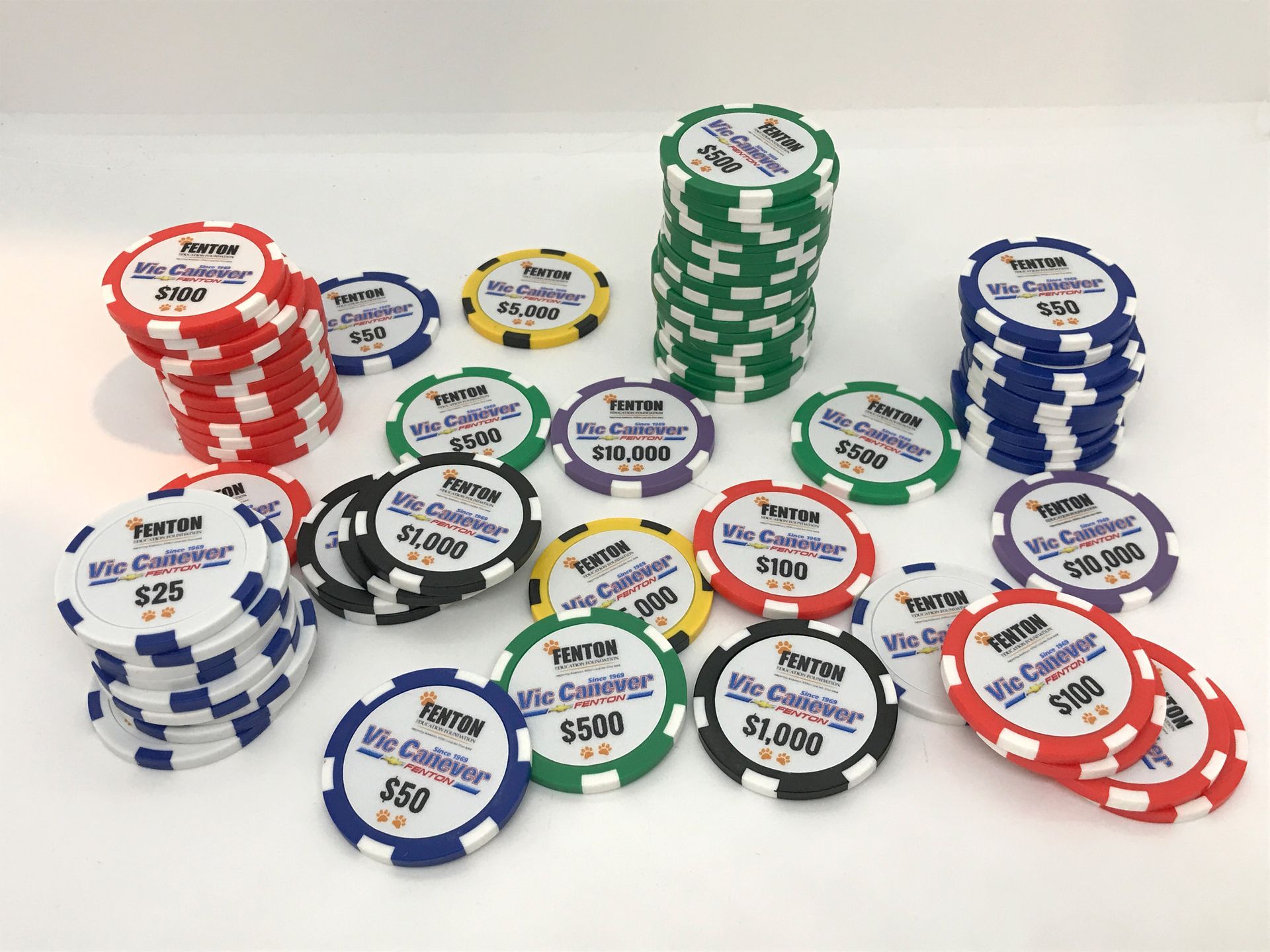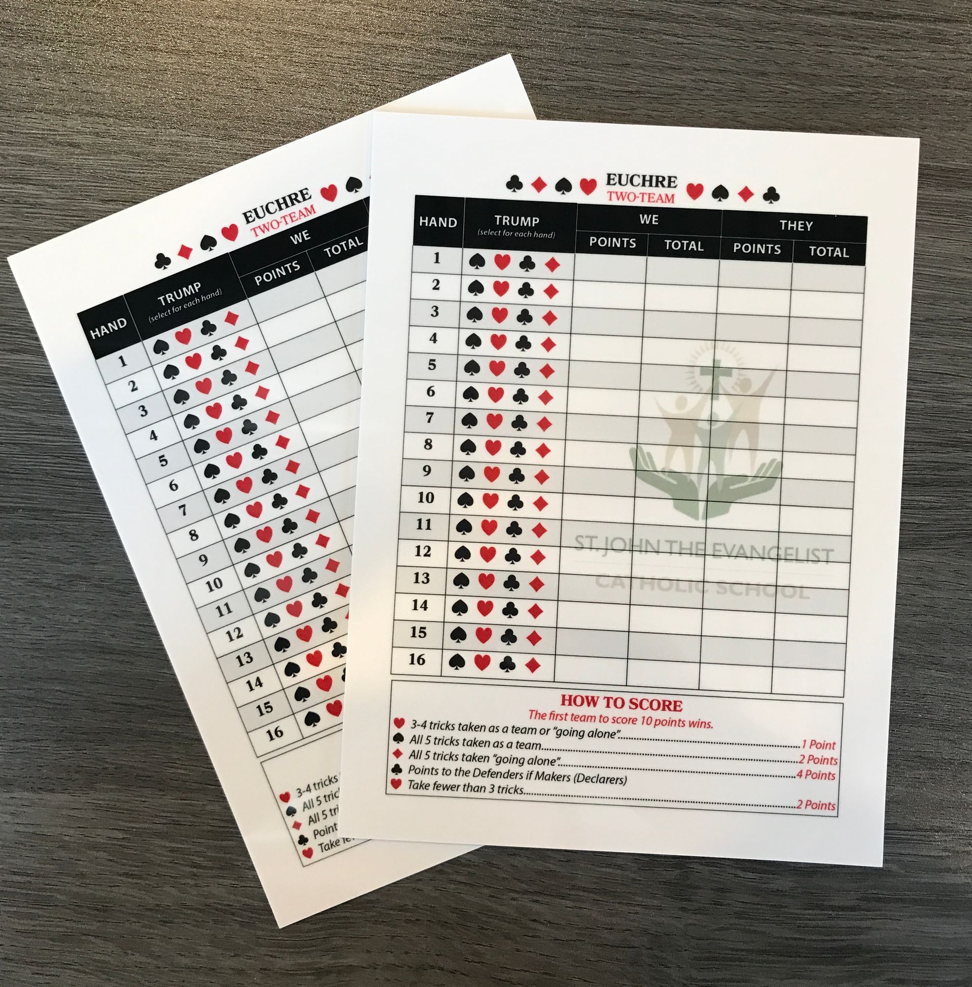 Recently we created playing cards, poker chips, and napkins featuring sponsors of the Fenton Education Foundation Texas Hold 'Em and Poker Night. The event was used to raise funds for the Fenton Education Foundation which awards grants within the Fenton School District to support education. The event saw 200 attendees and raised a total of $13,000+ for students. St. John Catholic School also requested custom dry-erase Euchre score boards, poker chips, coasters, engraved glasses, and golf ball prizes for their game night event. Check out the images below.