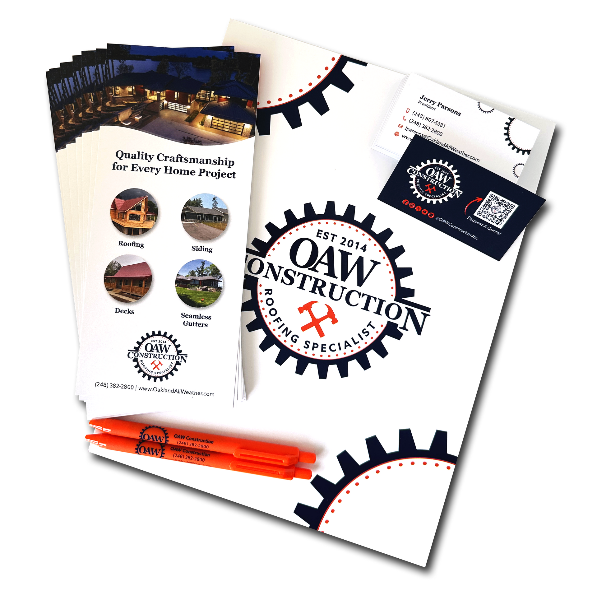 Oakland All Weather Construction Inc. purchased our branding package and we were able to provide them with the materials for a comprehensive branding strategy. We created a logo and brand guide which we used to create a new website showcasing their services. We also provided them with additionally purchased branded promotional products and merchandise to show off their brand and service. This included custom folders, pens, business cards, envelopes and letterheads, apparel, and signage for them to have a put together and professional look to match their services.